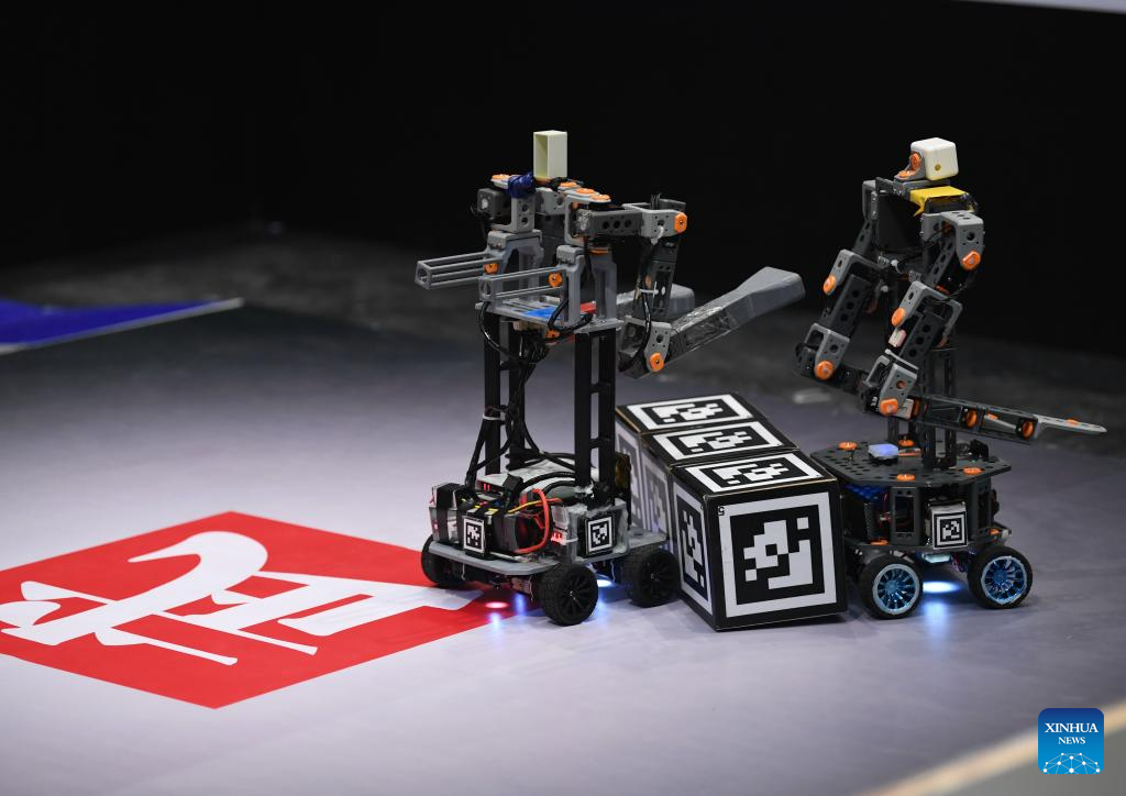 Robots compete during a martial art competition at the International Convention and Exhibition Center in Shijiazhuang, north China's Hebei Province, Oct. 17, 2025. The 2025 China Robot Competition and RoboCup China Open are held here from Friday to Sunday. (Xinhua/Yang Shiyao)