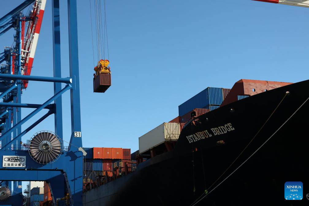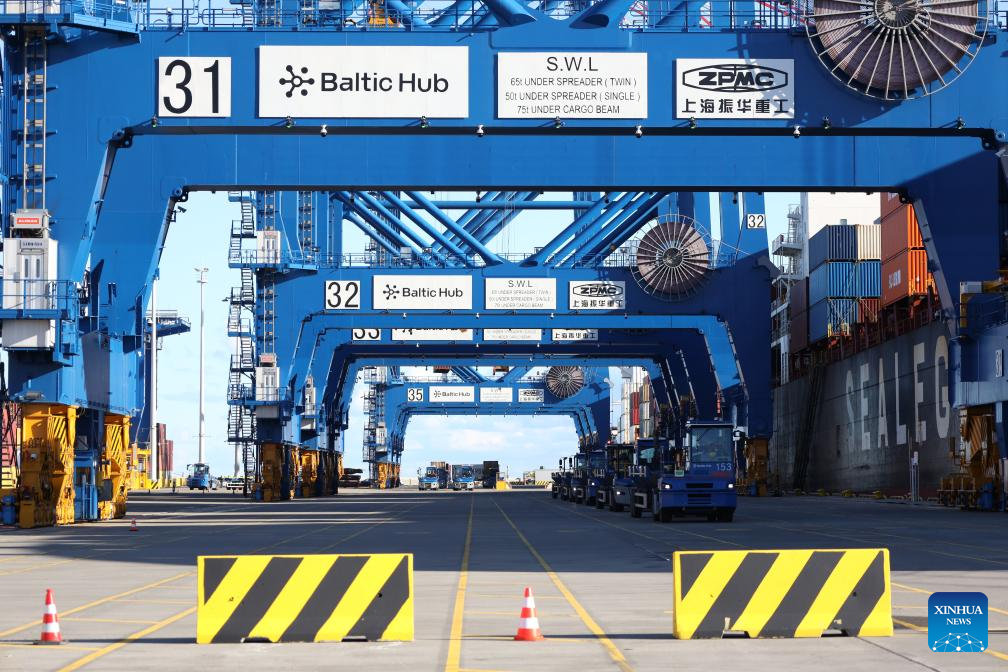 This photo taken on Oct. 19, 2025 shows a container unloaded from the "Istanbul Bridge," the first vessel on the China-Europe Arctic container express route, being loaded onto a truck at the Port of Gdansk, Poland. After a 26-day voyage, the first vessel on the China-Europe Arctic container express route arrived early Sunday at the Port of Gdansk, located on the Baltic Sea coast in northern Poland.