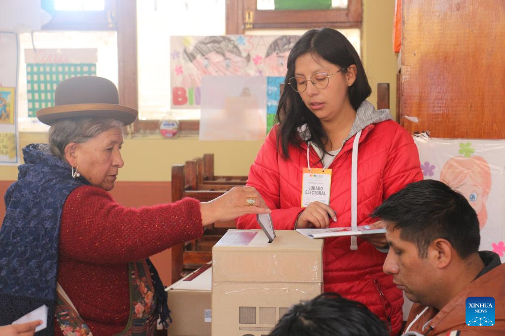 A voter casts her ballot at a polling station in La Paz, Bolivia, Oct. 19, 2025. Rodrigo Paz Pereira, 58, won the presidential runoff election in Bolivia on Sunday, according to the quick count of the Preliminary Results System of the Supreme Electoral Tribunal (TSE). (Xinhua/He Bing)