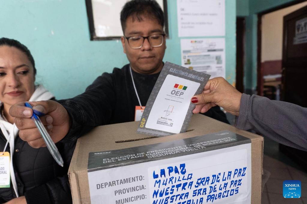 A voter casts a ballot at a polling station in La Paz, Bolivia, Oct. 19, 2025. Rodrigo Paz Pereira, 58, won the presidential runoff election in Bolivia on Sunday, according to the quick count of the Preliminary Results System of the Supreme Electoral Tribunal (TSE). (Photo by Javier Mamani/Xinhua)