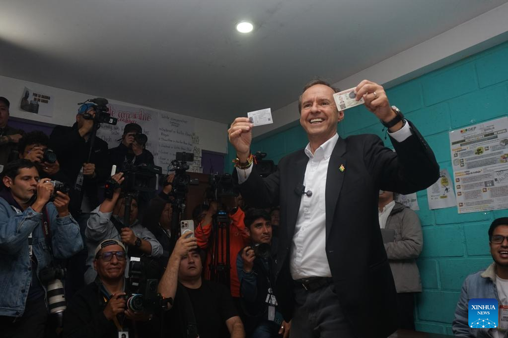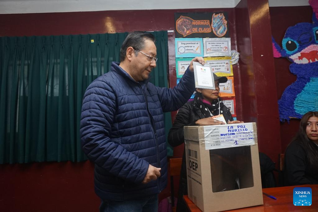 Bolivian President Luis Arce casts his ballot at a polling station in La Paz, Bolivia, Oct. 19, 2025. Rodrigo Paz Pereira, 58, won the presidential runoff election in Bolivia on Sunday, according to the quick count of the Preliminary Results System of the Supreme Electoral Tribunal (TSE). (Photo by Javier Mamani/Xinhua)