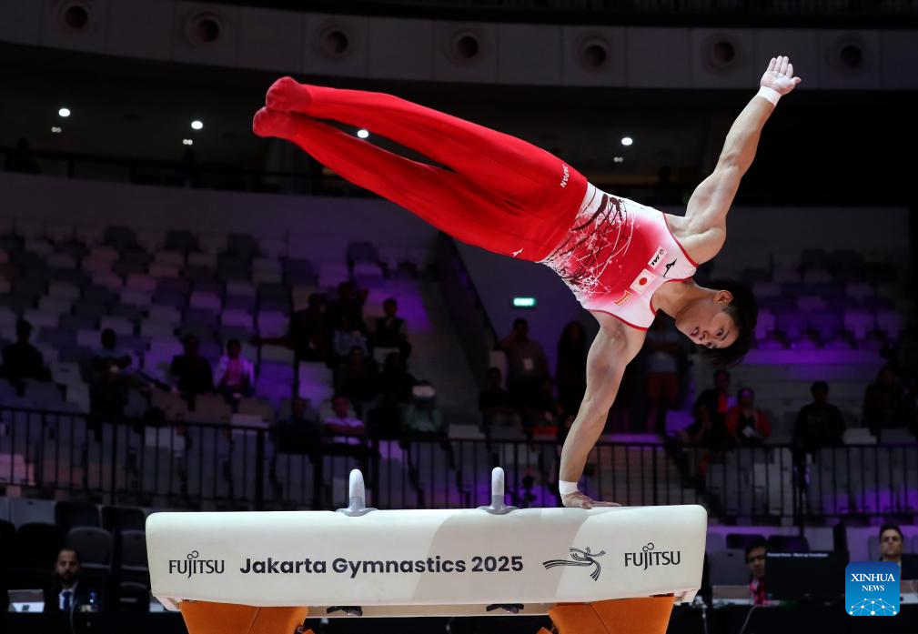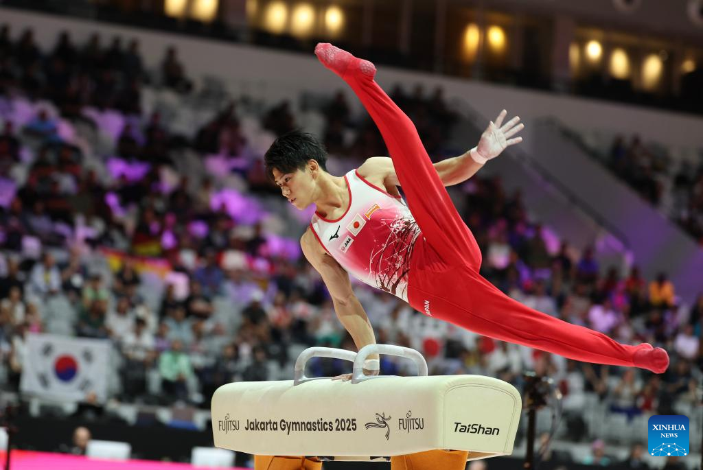 Hashimoto Daiki of Japan competes during the Pommel Horse of Men's All-Round Final at the 53rd FIG Artistic Gymnastics World Championships in Jakarta, Indonesia, on Oct. 22, 2025. (Xinhua/Bai Xuefei)