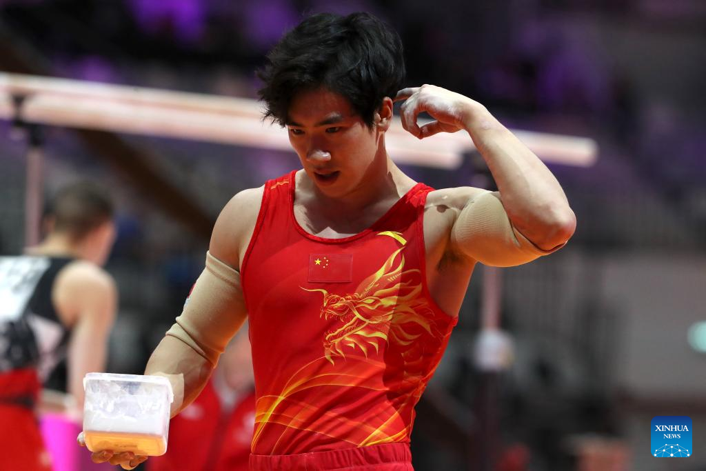 Zhang Boheng of China reacts after the Parallel Bars of Men's All-Round Final at the 53rd FIG Artistic Gymnastics World Championships in Jakarta, Indonesia, on Oct. 22, 2025. (Xinhua/Cen Yunpeng)