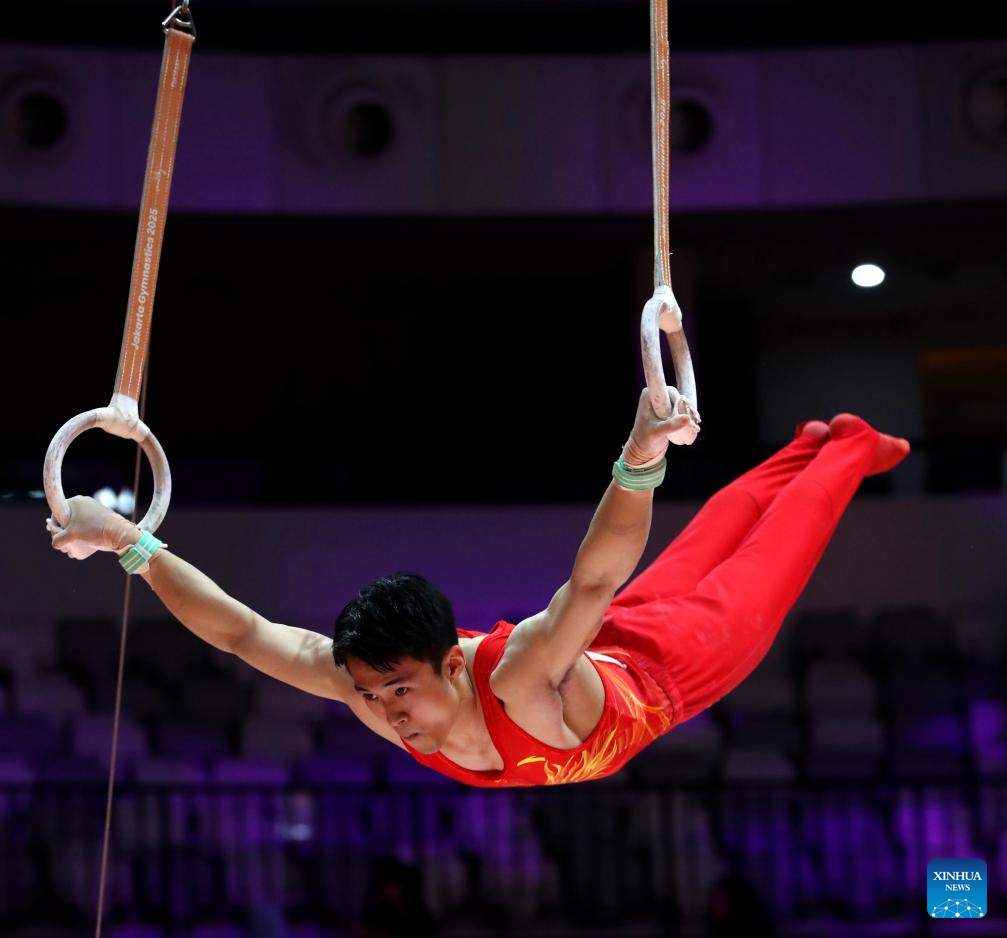 Shi Cong of China competes during the Rings of Men's All-Round Final at the 53rd FIG Artistic Gymnastics World Championships in Jakarta, Indonesia, on Oct. 22, 2025. (Xinhua/Cen Yunpeng)