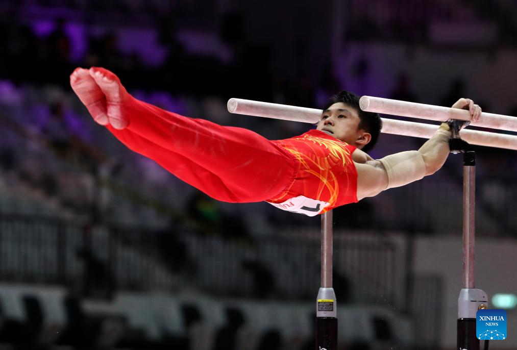 Shi Cong of China competes during the Parallel Bars of Men's All-Round Final at the 53rd FIG Artistic Gymnastics World Championships in Jakarta, Indonesia, on Oct. 22, 2025. (Xinhua/Cen Yunpeng)