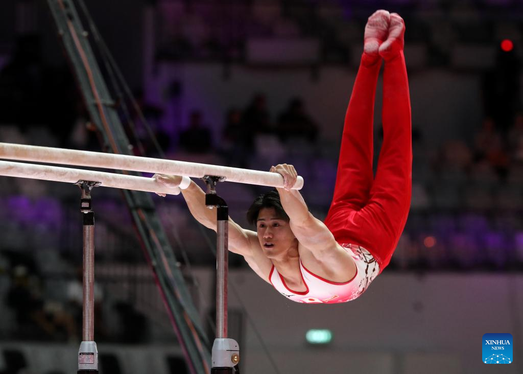 Hashimoto Daiki of Japan competes during the Parallel Bars of Men's All-Round Final at the 53rd FIG Artistic Gymnastics World Championships in Jakarta, Indonesia, on Oct. 22, 2025. (Xinhua/Cen Yunpeng)