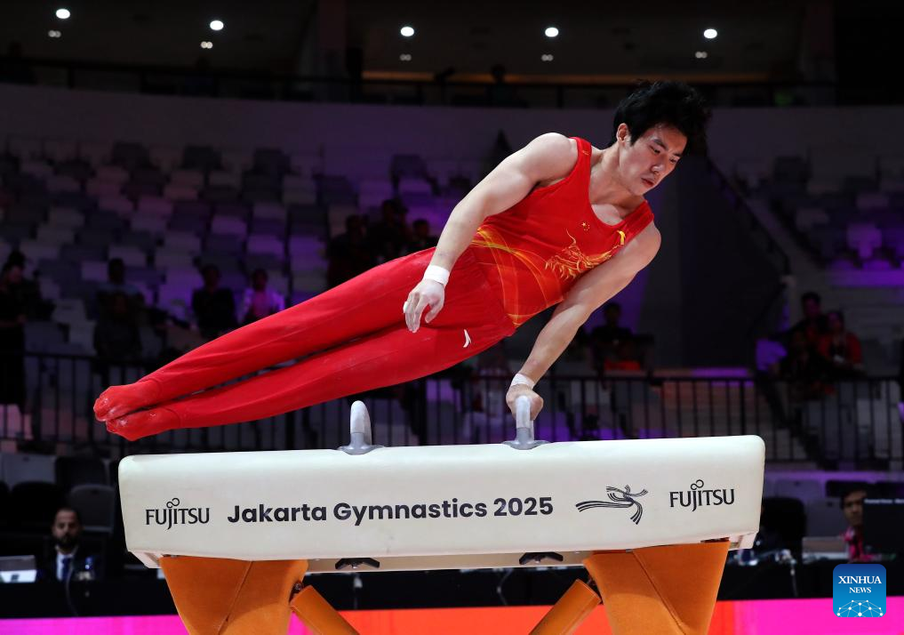 Zhang Boheng of China competes during the Pommel Horse of Men's All-Round Final at the 53rd FIG Artistic Gymnastics World Championships in Jakarta, Indonesia, on Oct. 22, 2025. (Xinhua/Cen Yunpeng)