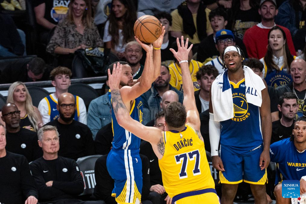 Los Angeles Lakers' Luka Doncic (L) is defended by Golden State Warriors' Stephen Curry during the 2025-2026 NBA regular season match between Los Angeles Lakers and Golden State Warriors in Los Angeles, the United States, Oct. 21, 2025. (Photo by Ringo Chiu/Xinhua)