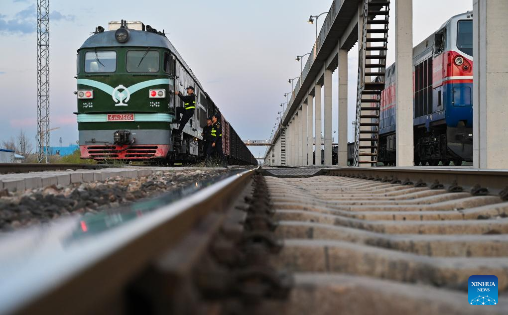 Customs staff check a China-Europe freight train parking at the Horgos railway port in Horgos, northwest China's Xinjiang Uygur Autonomous Region, Sept. 10, 2025. In the first three quarters of this year, the region's import and export value surged to 393.14 billion yuan (about 55.19 billion U.S. dollars), marking a 22.1 percent year on year increase, according to Urumqi Customs. (Xinhua/Li He)