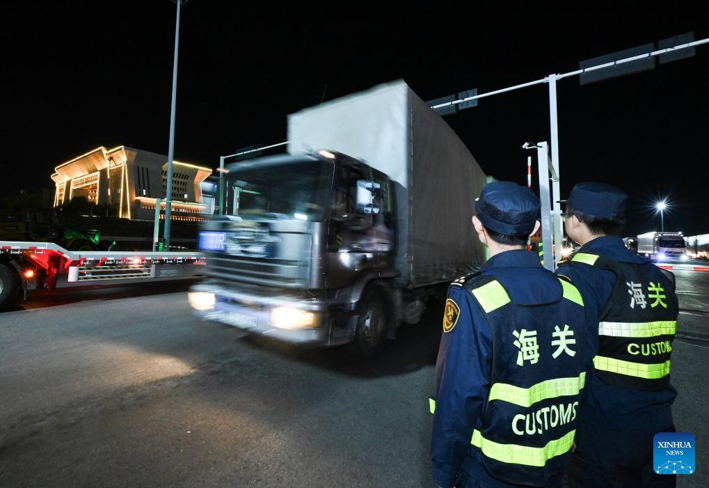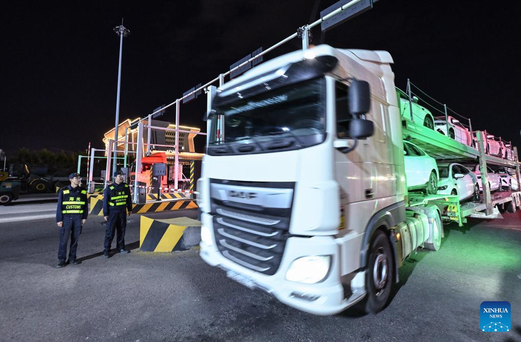 An outbound freight vehicle leaves the road port of Horgos, northwest China's Xinjiang Uygur Autonomous Region, Sept. 10, 2025. In the first three quarters of this year, the region's import and export value surged to 393.14 billion yuan (about 55.19 billion U.S. dollars), marking a 22.1 percent year on year increase, according to Urumqi Customs. (Xinhua/Li He)