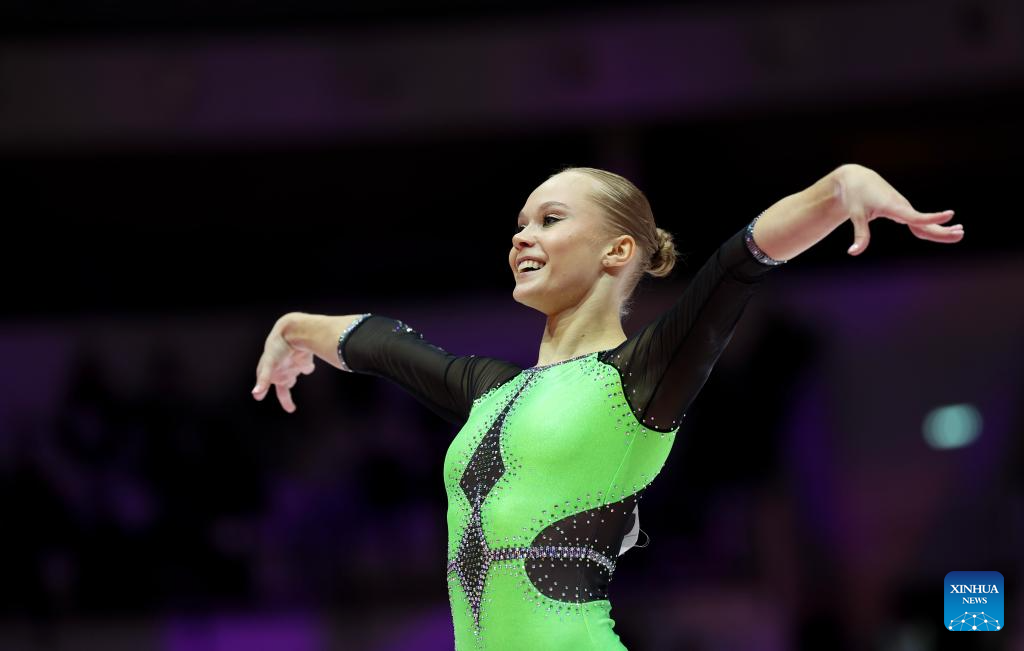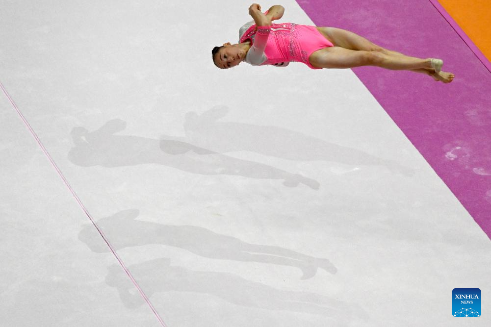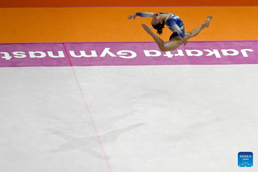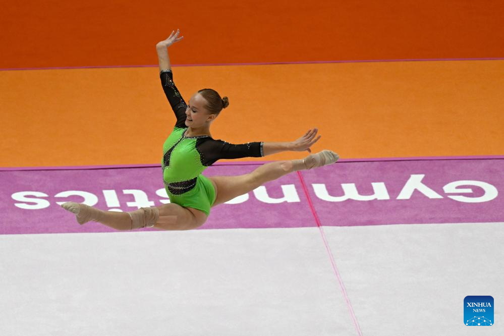 Angelina Melnikova of AIN (Individual Neutral Athlete) competes during the Floor Exercise of the Women's All-Round Final at the 53rd FIG Artistic Gymnastics World Championships in Jakarta, Indonesia, on Oct. 23, 2025. (Xinhua/Bai Xuefei)