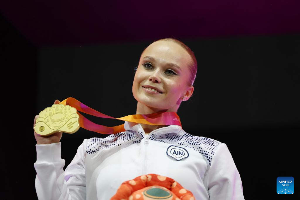 Gold medalist Angelina Melnikova of AIN (Individual Neutral Athlete) poses on the podium during the awarding ceremony for the Women's All-Round Final at the 53rd FIG Artistic Gymnastics World Championships in Jakarta, Indonesia, on Oct. 23, 2025. (Xinhua/Bai Xuefei)