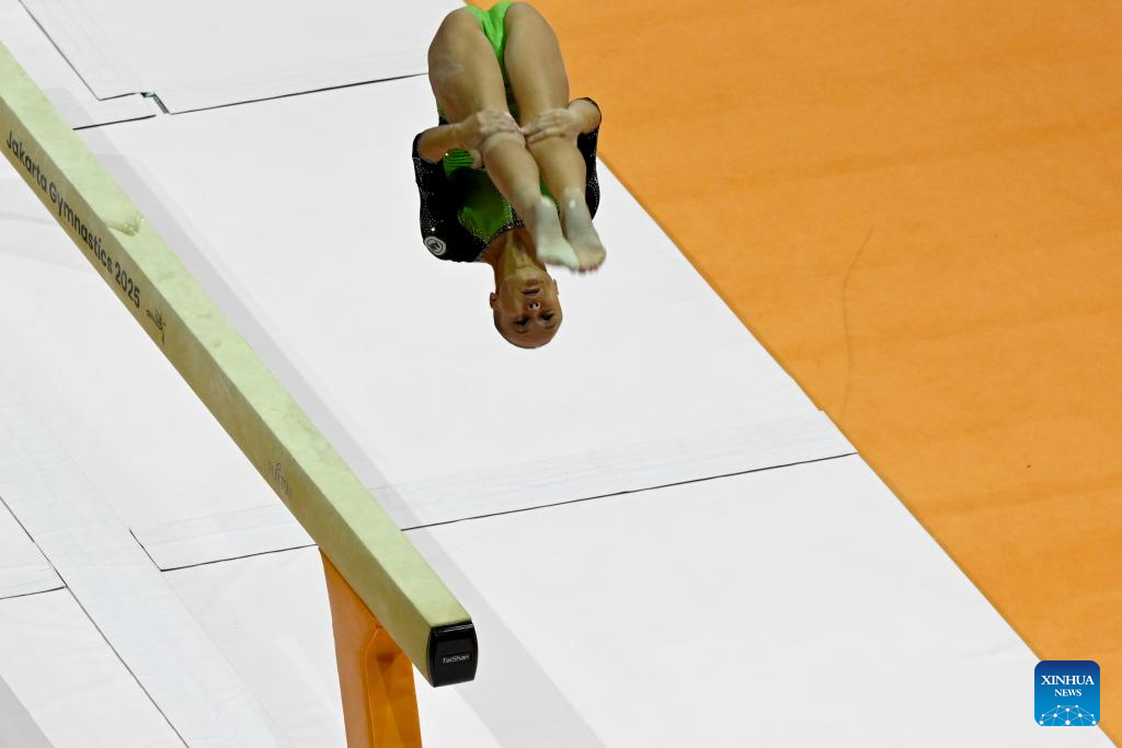 Angelina Melnikova of AIN (Individual Neutral Athlete) competes during the Balance Beam of the Women's All-Round Final at the 53rd FIG Artistic Gymnastics World Championships in Jakarta, Indonesia, on Oct. 23, 2025. (Xinhua/Agung Kuncahya B.)