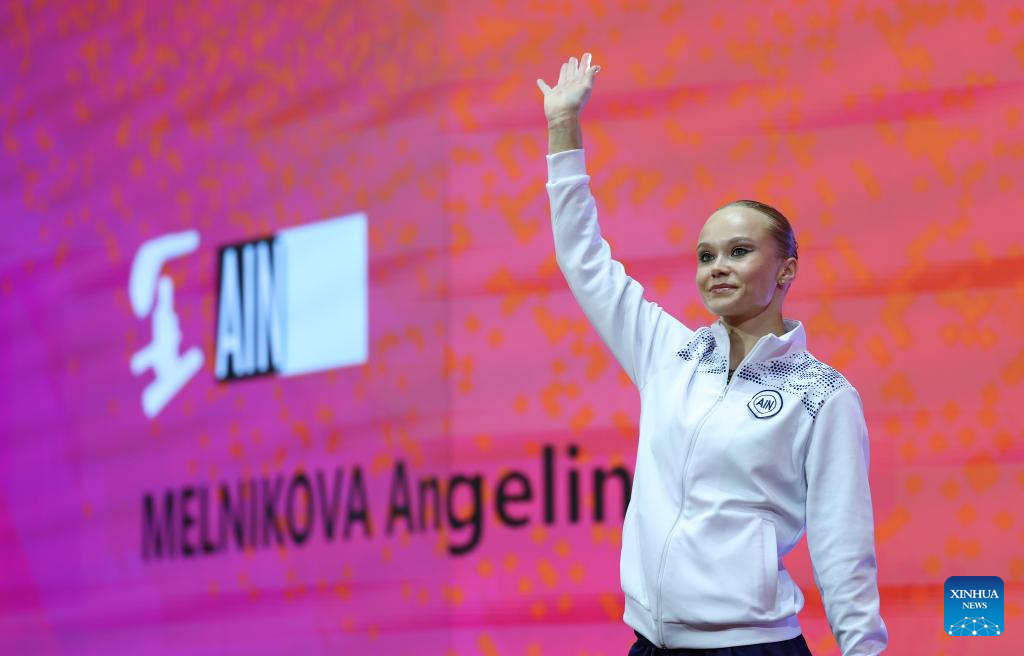 Angelina Melnikova of AIN (Individual Neutral Athlete) gestures before the Women's All-Round Final at the 53rd FIG Artistic Gymnastics World Championships in Jakarta, Indonesia, on Oct. 23, 2025. (Xinhua/Bai Xuefei)