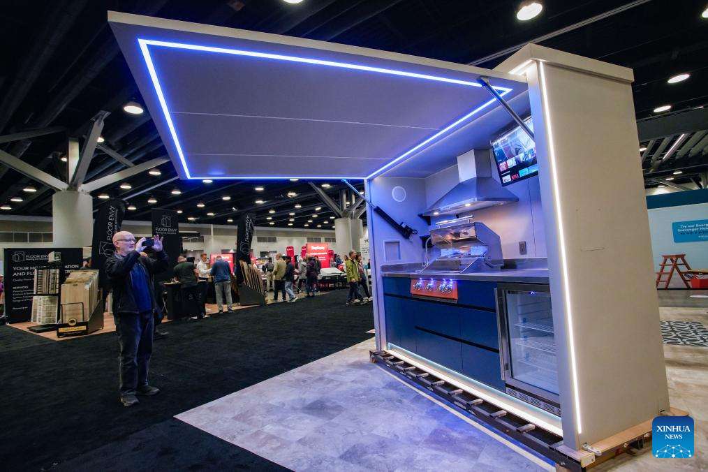 A man takes a photo of an outdoor kitchen during the 2025 Vancouver Fall Home Show at the Vancouver Convention Centre in Vancouver, Canada, Oct. 23, 2025. The 2025 Vancouver Fall Home Show kicked off here on Thursday and will last until Sunday, showcasing home-related products and services. (Photo by Liang Sen/Xinhua)