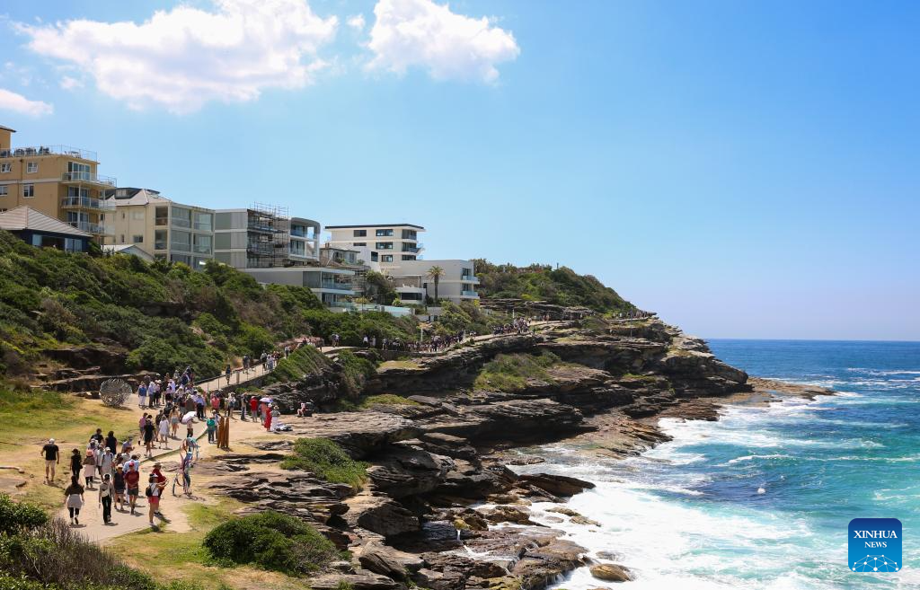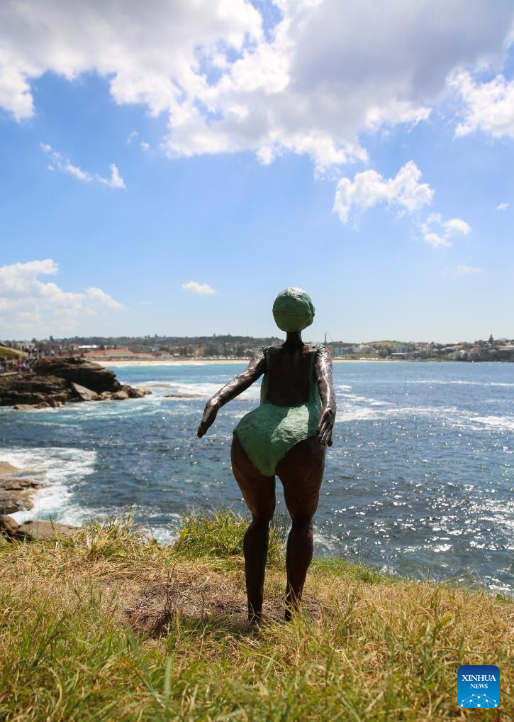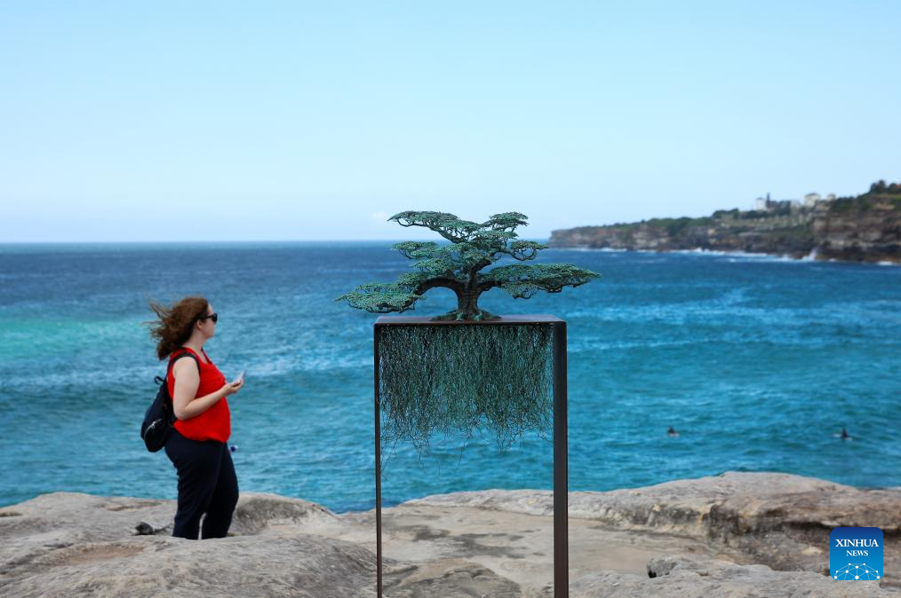Visitors view exhibits at the seaside in Sydney, Australia, Oct. 24, 2025. Featuring sculptures by artists from Australia and across the world, the outdoor exhibition dubbed "Sculpture by the Sea" is held along the Bondi to Tamarama coastal walk in Sydney and will run until Nov. 3 this year. (Xinhua/Ma Ping)