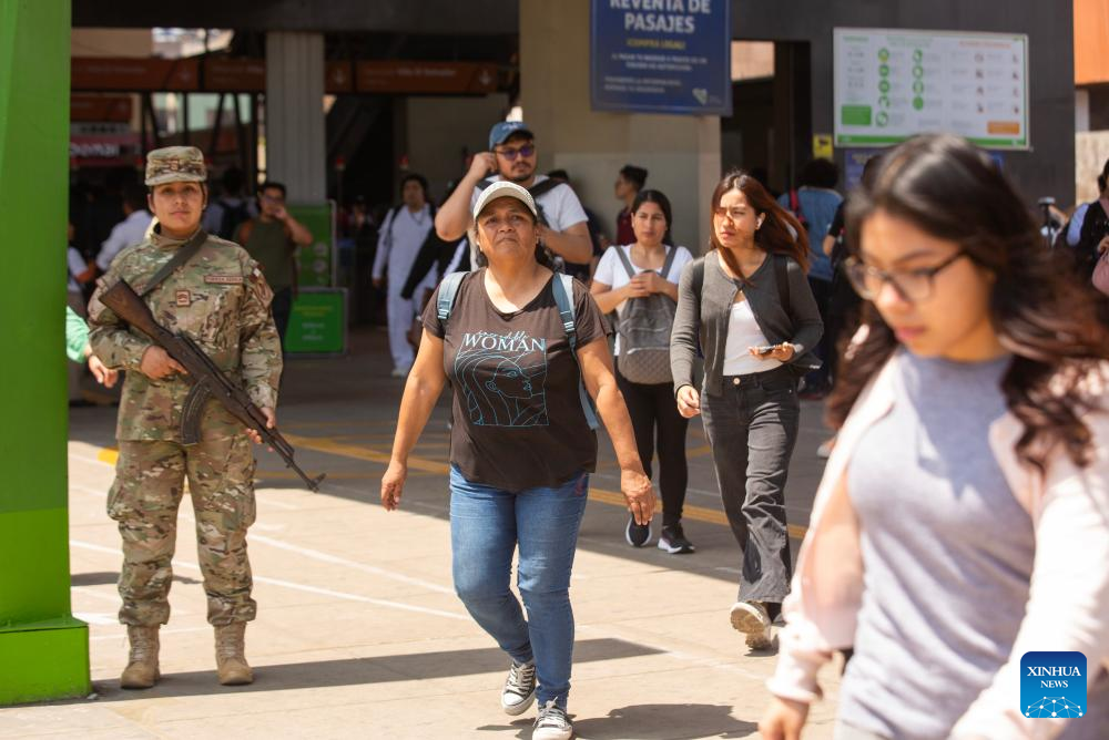 A service woman patrols the La Cultura metro station in Lima, Peru, on Oct. 22, 2025. Peruvian President Jose Jeri declared on Tuesday a 30-day state of emergency for the capital Lima and the neighboring Callao region to tackle worsening public security. (Xinhua/Mariana Bazo)