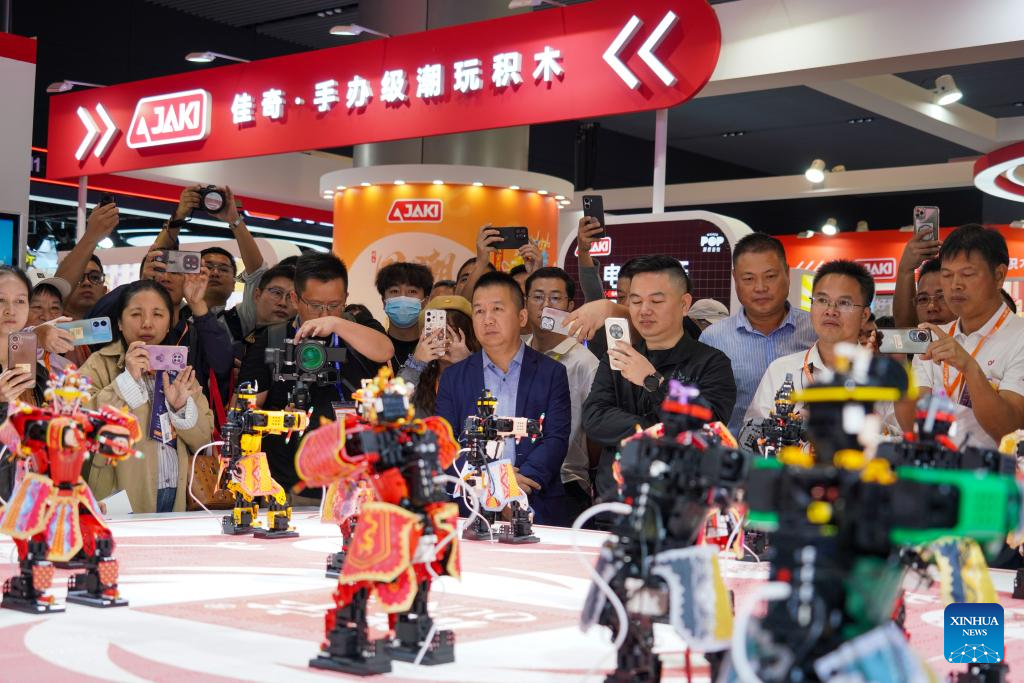 Visitors watch robots performing a Yingge dance at a booth during an international toys&gifts fair held in Shantou City, south China's Guangdong Province on Oct. 23, 2025. The four-day event attracts approximately 2,000 brands from around the world, with over 250,000 products on display, covering the entire industrial chain of toys including design, manufacturing and sales. (Xinhua/Xiao Ennan)