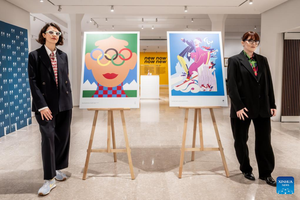 Italian artists Olimpia Zagnoli (L) and Carolina Altavilla pose with the posters during the unveiling ceremony for the Official Iconic Posters for the Olympic and Paralympic Winter Games Milano Cortina 2026 at Triennale Milano in Milan, Italy, on Oct. 22, 2025. (Xinhua)