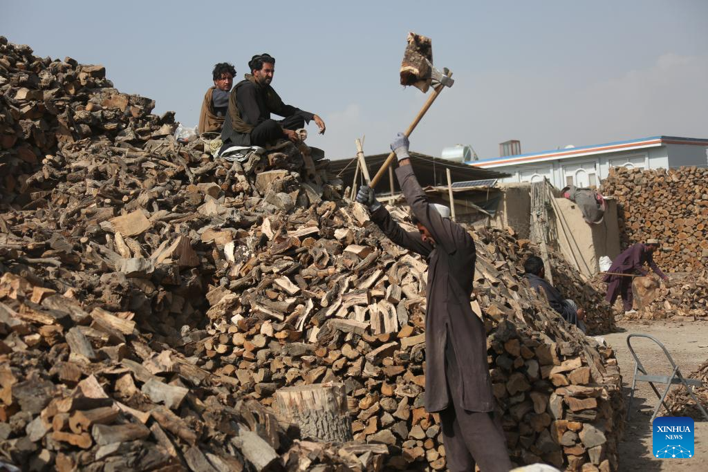 An Afghan worker chops wood at a firewood shop in Kabul, Afghanistan, Oct. 21, 2025. (Photo by Saifurahman Safi/Xinhua)