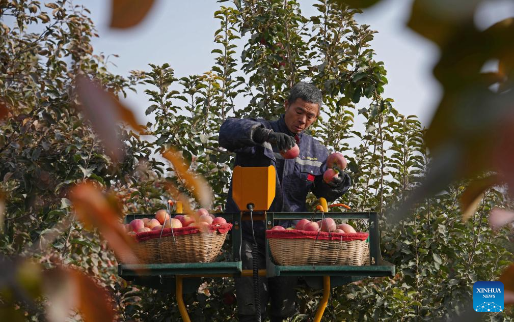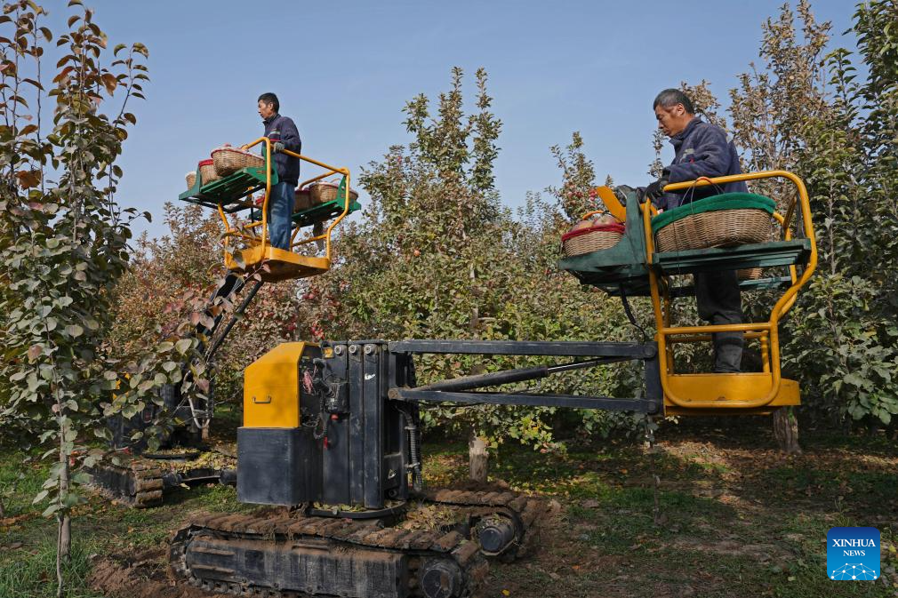 Staff members operate intelligent harvesting machines to pick apples at an orchard in Alaer City, northwest China's Xinjiang Uygur Autonomous Region, Oct. 23, 2025. Xinjiang's abundant sunshine and significant day-night temperature variations create ideal conditions for growing fruits with naturally high sugar content. The apple produced here with thin skin and dense and juicy flesh has become a signature specialty of Alaer. (Xinhua/Cai Yang)