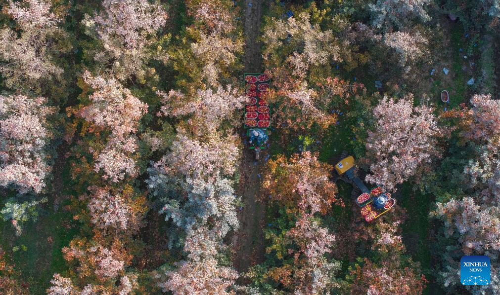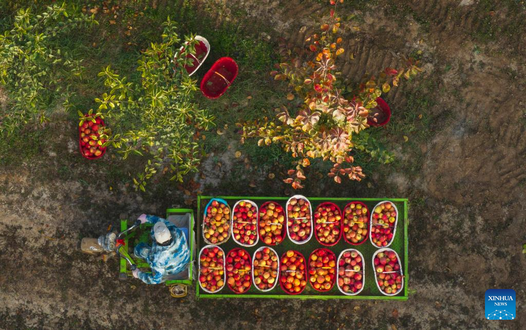 An aerial drone photo taken on Oct. 23, 2025 shows a staff member transporting newly-picked apples at an orchard in Alaer City, northwest China's Xinjiang Uygur Autonomous Region. Xinjiang's abundant sunshine and significant day-night temperature variations create ideal conditions for growing fruits with naturally high sugar content. The apple produced here with thin skin and dense and juicy flesh has become a signature specialty of Alaer. (Xinhua/Cai Yang)