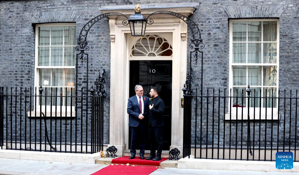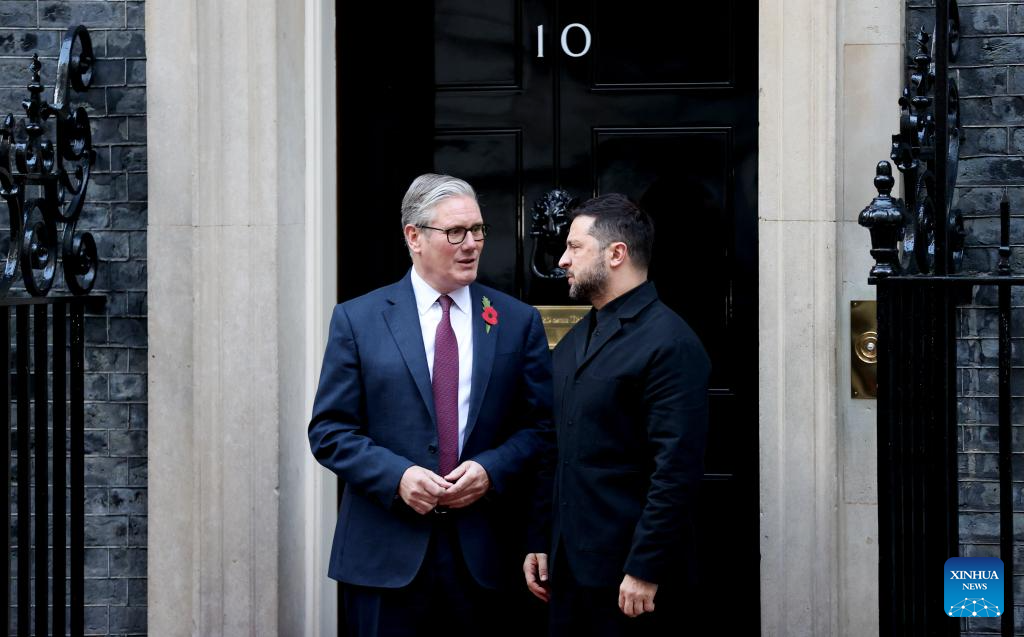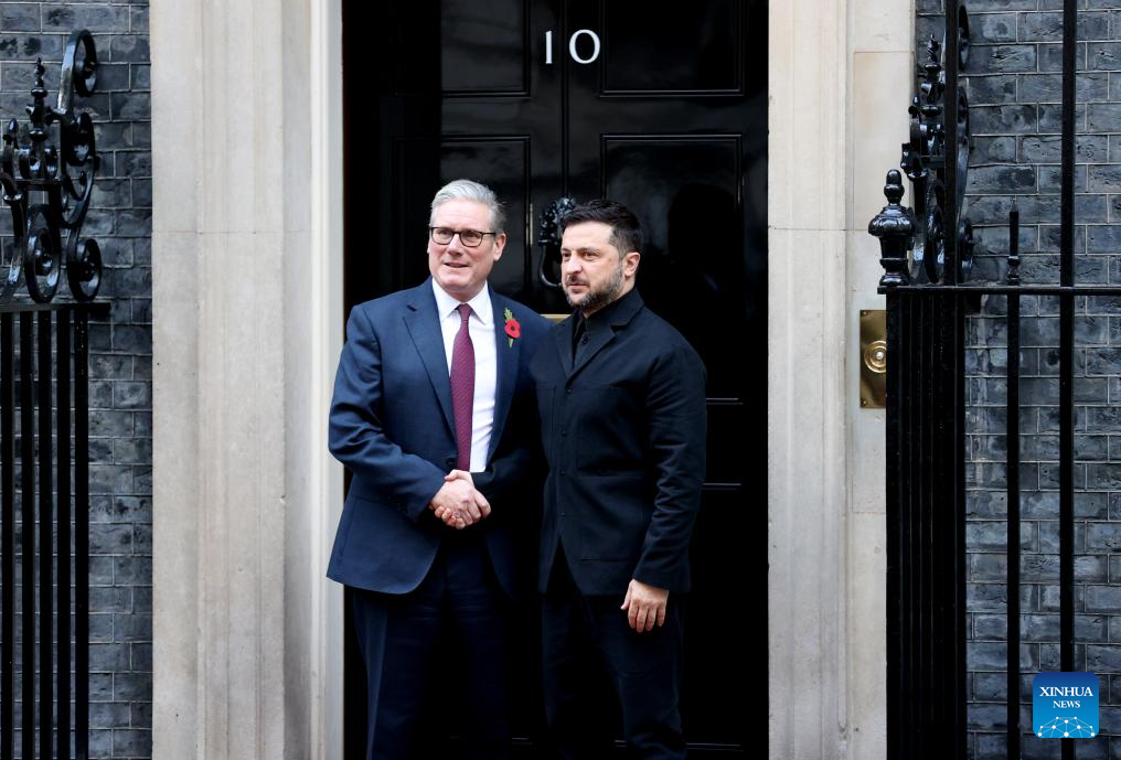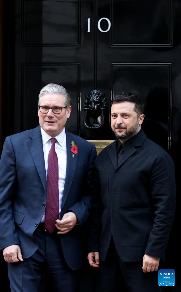 British Prime Minister Keir Starmer (L) welcomes visitting Ukrainian President Volodymyr Zelensky at 10 Downing Street in London, Britain, Oct. 24, 2025. (Xinhua/Li Ying)