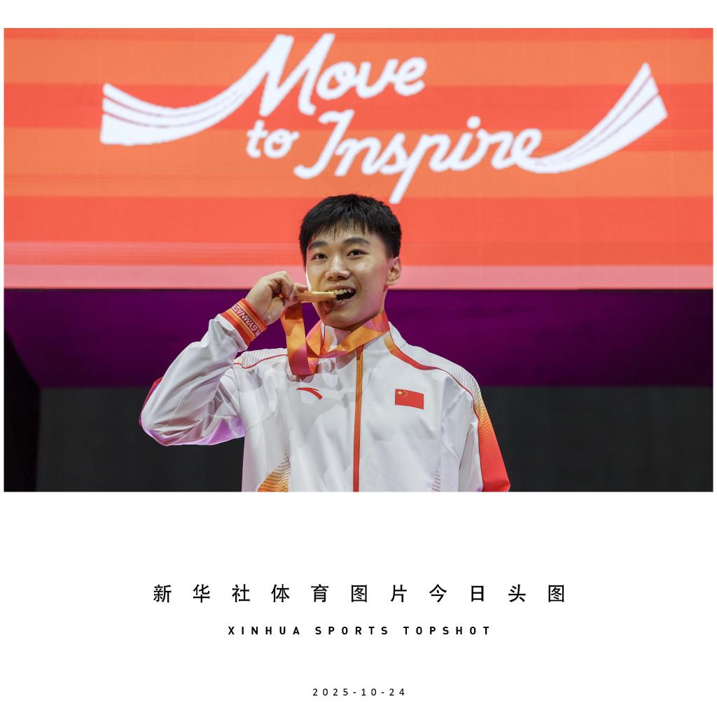 Hong Yanming of China celebrates during the awarding ceremony for the Men's Pommel Horse Final at 53rd FIG Artistic Gymnastics World Championships in Jakarta, Indonesia, on Oct. 24, 2025. (Xinhua/Bai Xuefei)