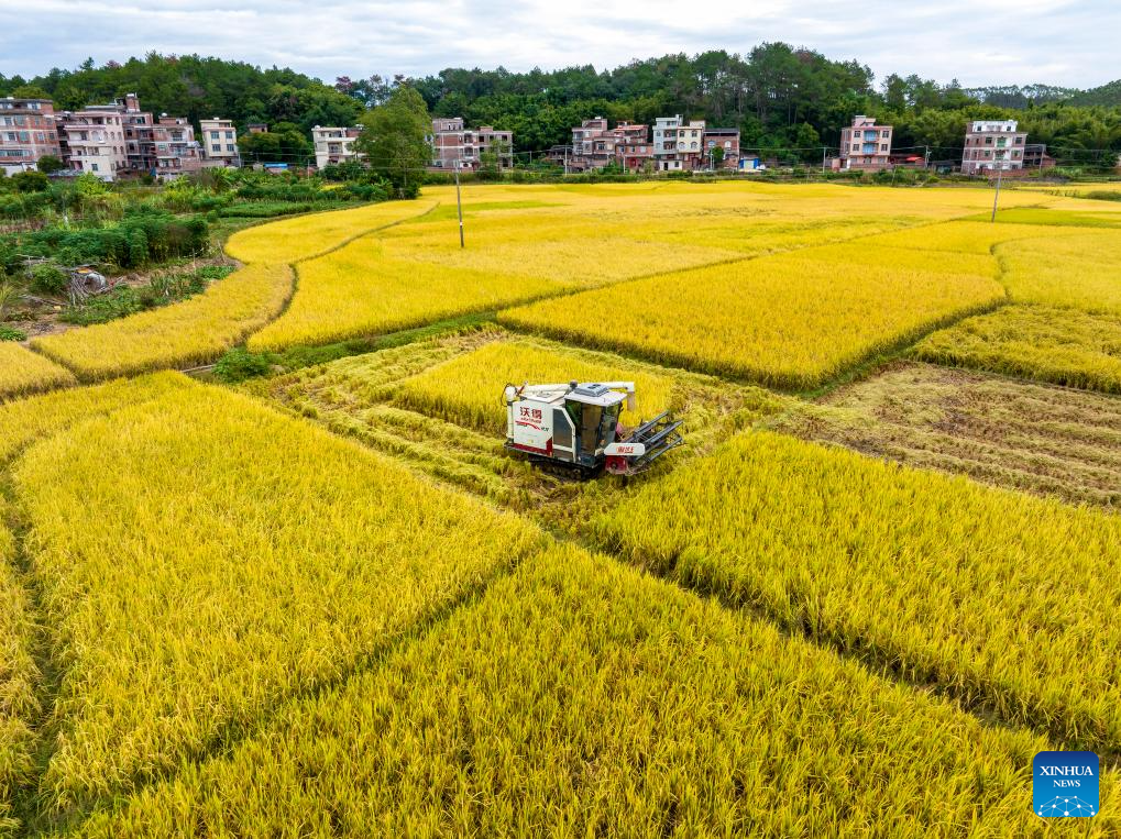 This aerial drone photo taken on Oct. 23, 2025 shows a reaper harvesting rice in Hezhou, south China's Guangxi Zhuang Autonomous Region. Thursday marks the Frost's Descent. As the last solar term in autumn, Frost's Descent signifies the upcoming winter. Days around Frost's Descent are harvest time for most crops. (Photo by Liao Zuping/Xinhua)