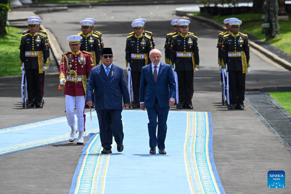 Indonesian President Prabowo Subianto (L, front) and Brazilian President Luiz Inacio Lula da Silva (R, front) inspect the guard of honor during a welcome ceremony at Merdeka Palace in Jakarta, Indonesia, Oct. 23, 2025. (Photo by Zulkarnain/Xinhua)
