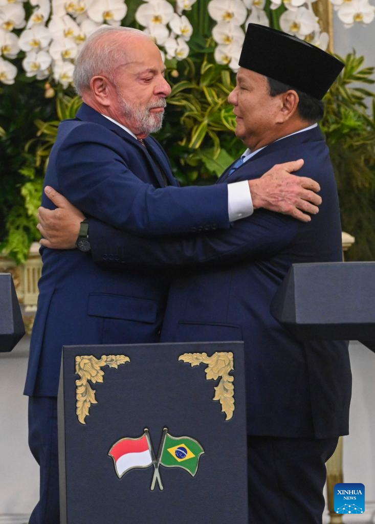 Indonesian President Prabowo Subianto (R) and Brazilian President Luiz Inacio Lula da Silva attend a joint press conference at Merdeka Palace in Jakarta, Indonesia, Oct. 23, 2025. (Photo by Zulkarnain/Xinhua)
