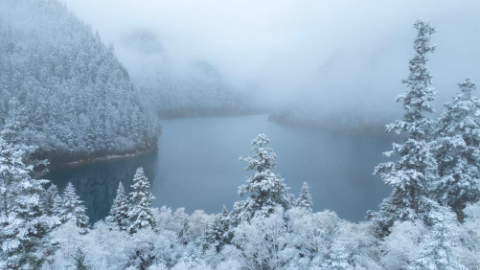 Aerial view of Jiuzhaigou scenic spot after snow