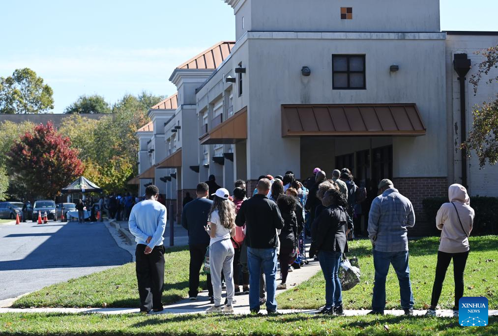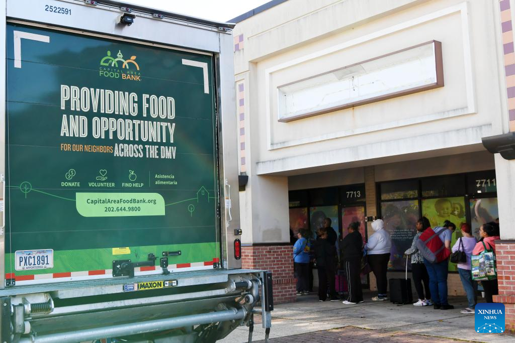 Federal employees and contractors line up to receive food during a free food distribution in Hyattsville, Maryland, the United States, on Oct. 21, 2025. Starting this week, the nonprofit Capital Area Food Bank started to provide special free food distributions to U.S. federal employees and contractors.
