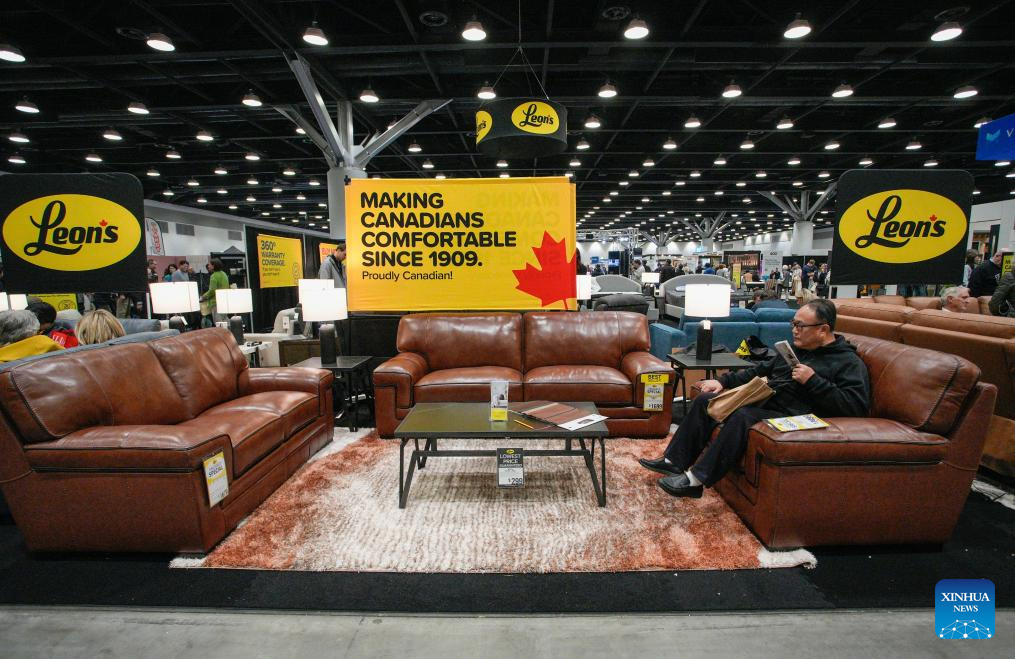A man tries out a sofa during the 2025 Vancouver Fall Home Show at the Vancouver Convention Centre in Vancouver, Canada, Oct. 23, 2025. The 2025 Vancouver Fall Home Show kicked off here on Thursday and will last until Sunday, showcasing home-related products and services. (Photo by Liang Sen/Xinhua)