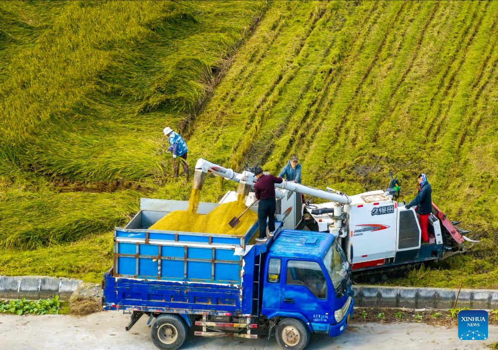 An aerial drone photo taken on Oct. 22, 2025 shows a farmer harvesting paddy in Baiguo Town of Hengshan County in Hengyang City, central China's Hunan Province. (Photo by Cao Zhengping/Xinhua)